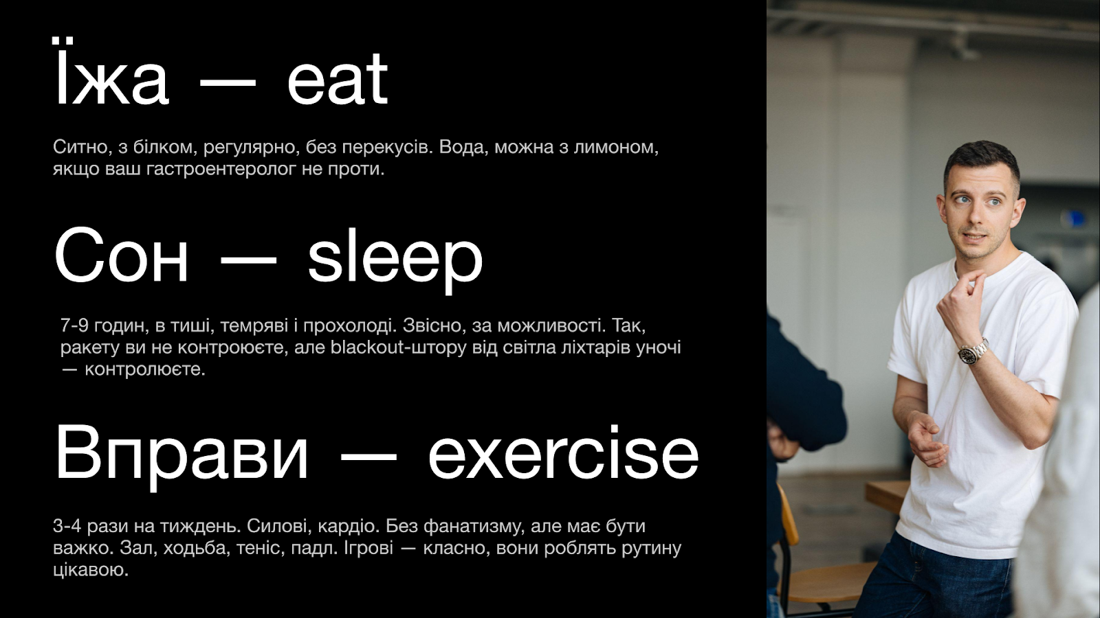 Я вважаю, кожному варто мати рутини в 3-х сферах — eat, sleep, exercise.