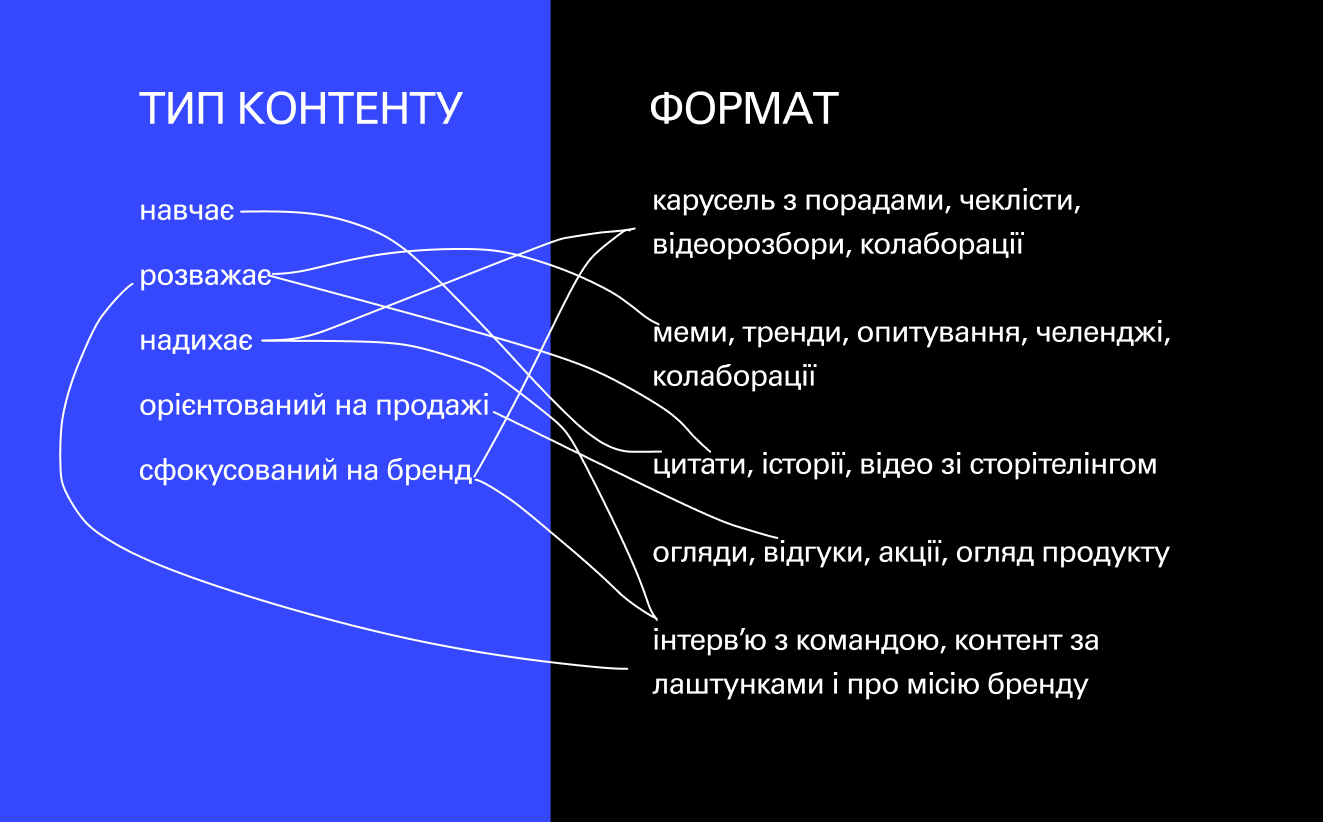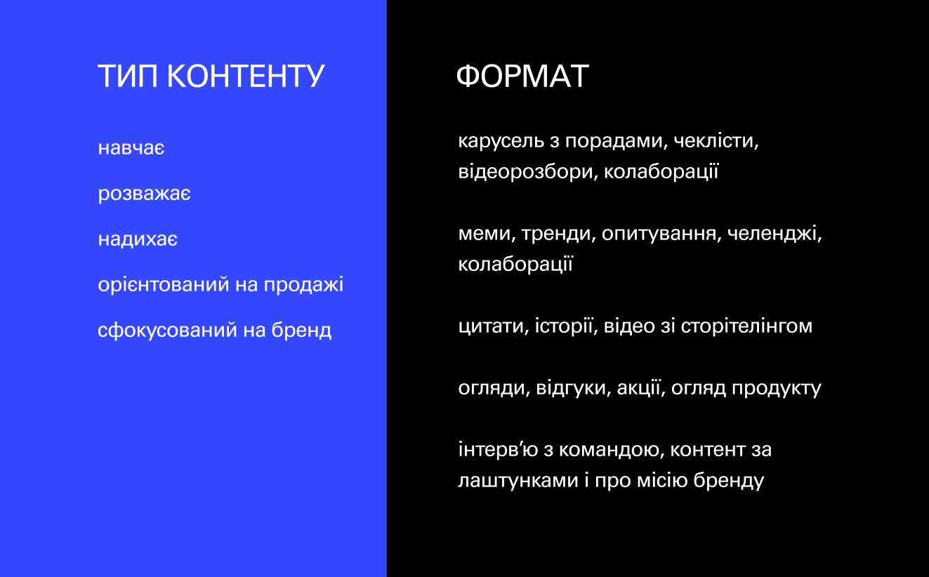 Формат контенту залежить від пазлів SMM стратегії, які пройшли вище: аудиторії, ToV, соцмережі та того, що саме ви хочете сказати.