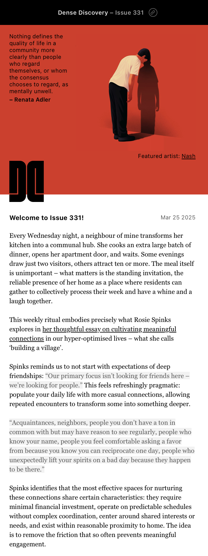 Кай, творець розсилки, якось сказав: «Я не продаю контент, я продаю увагу». І це відчувається. Коли читаєте Dense Discovery, розумієте, що автор справді присвятив час, щоб знайти щось вартісне. Це створює неймовірну довіру. Просто варто хоча б один раз подивитися лист і зрозуміти, що ця розсилка — приклад гарної структури, продуманих деталей та дійсно якісної інформацію, яку чекаєте щоразу.