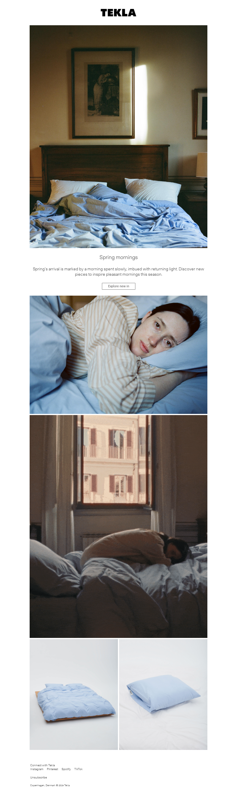 TEKLA не продають постільну білизну — вони продають ритуал повільного весняного ранку, чистоти та спокою. Єдиний заклик до дії — скромне "Explore new in" — настільки органічний, що здається логічним продовженням наративу, а не маркетинговим гачком.