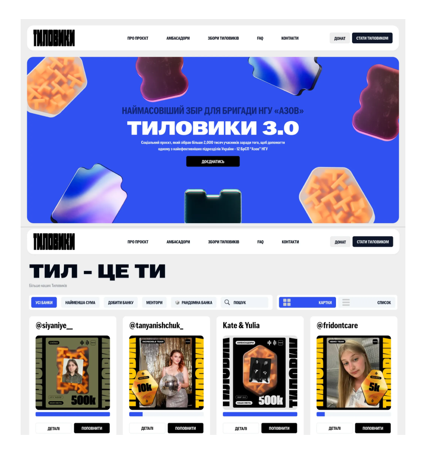 Креатив для зборів виходить за межі соцмереж. Наприклад, у Тиловиків Азову тепер є власна вебплатформа з уже впізнаваною айдентикою. На ній можна відстежувати актуальні збори та долучатися до них у різних ролях. Абсолютно безкінечна в розвитку історія.