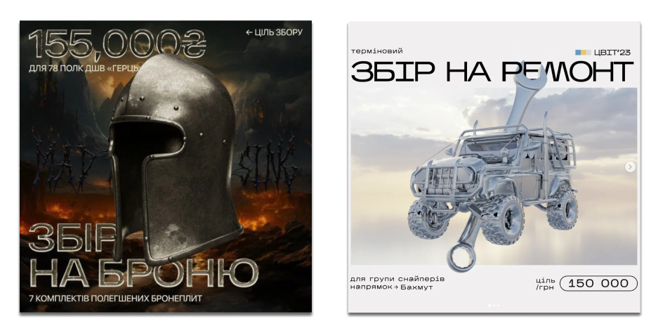 Перші збори на початку російсько-української війни у 2014-му створювали фізично — на вулиці, на заходах — або в соцмережах із закликом передати речі та обладнання військовим. Тоді ще не було детально продуманих графічних рішень. З 24 лютого 2022 року ситуація зовсім змінилась. Відійшовши від шоку повномасштабного вторгнення, українці взялися допомагати нашому війську. Зокрема креативно. Тепер, окрім допису в інстаграмі, запускаються цілі комунікаційні кампанії для окремого збору — великих чи маленьких.