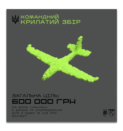 Тут зійшлися 3D та метафора крил та БПЛА із конструктора. Бо єдність. Бо збір складається з кожного, хто долучився — і донатом, і дружньою банкою.