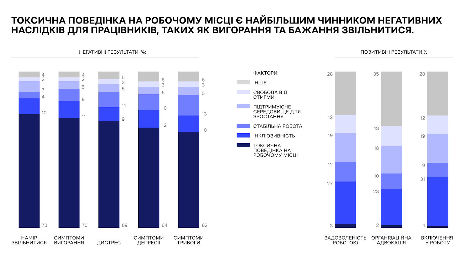 Інститут охорони здоров'я McKinsey провів дослідження про токсичні робочі місця та як вони впливають на команди. Дослідники поспілкувалися з майже 15 000 співробітників та 1000 особами, які ухвалюють рішення щодо управління персоналом у 15 різних країнах. Токсична поведінка виявилася основним каталізатором негативних наслідків для працівників, таких як вигорання і бажання звільнитися.