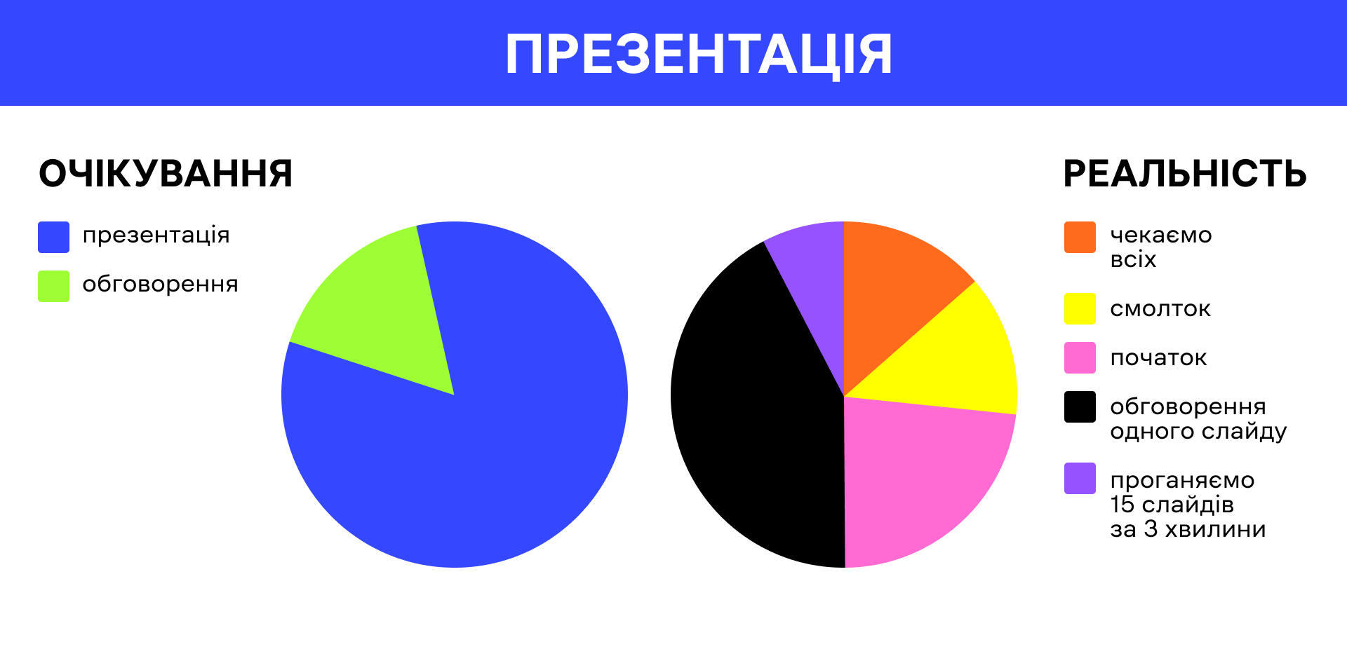 Трохи цифр для роздумів: за даними Dialpad, 83% працівників витрачають до третини робочого тижня на зустрічі, але лише 30% з них виявляються дійсно продуктивними. Як на мене, не дуже надихаюче. Пропоную провести експрес-тест і дізнатися, чи належите ви до цієї статистики.