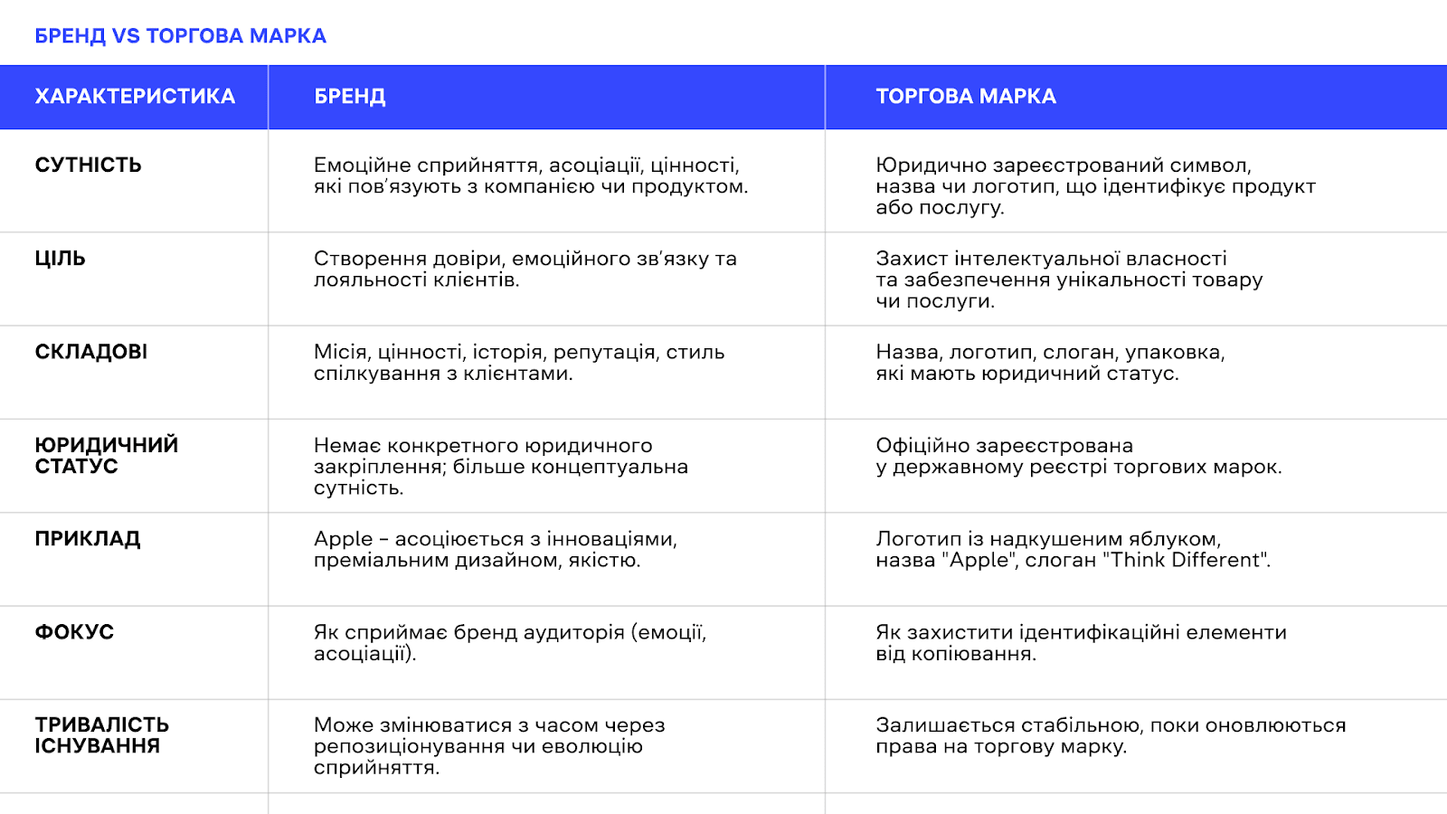 Торгова марка — це про сукупність усіх відмінних рис від конкурентів — від товару до матеріалів, що ви публікуєте. В основі торгової марки завжди є товар чи послуга, що ви продаєте, ключовим атрибутом є торговий знак (логотип або відмінний візуальний знак), зазвичай застосовується для юридичного захисту. А от усе це ієрархічно можна описати концепцією бренду — сукупністю асоціативних думок споживачів про ваш товар чи послугу, команду, сервіс та інше.
