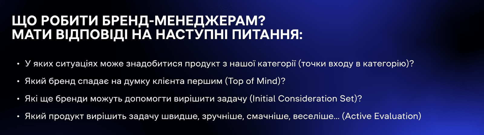 Ситуація споживання — ваш продукт має бути потрібним, і для цього варто вибудовувати асоціації через різноманітні ситуації споживання. Мій улюблений приклад — McDonald's. Коли мені потрібно швидко поїсти, я йду у McDonald's — пряма асоціація зі швидким харчуванням.